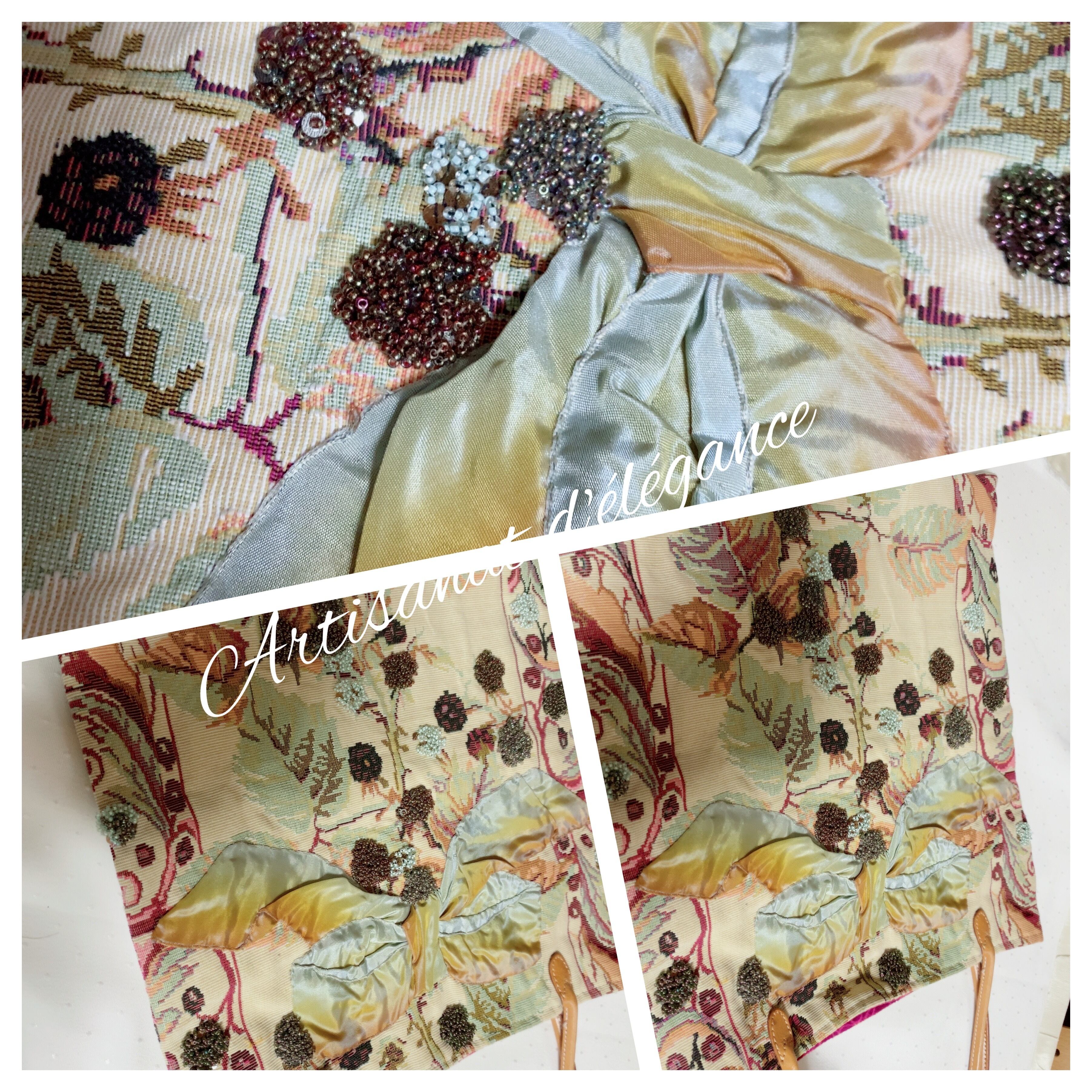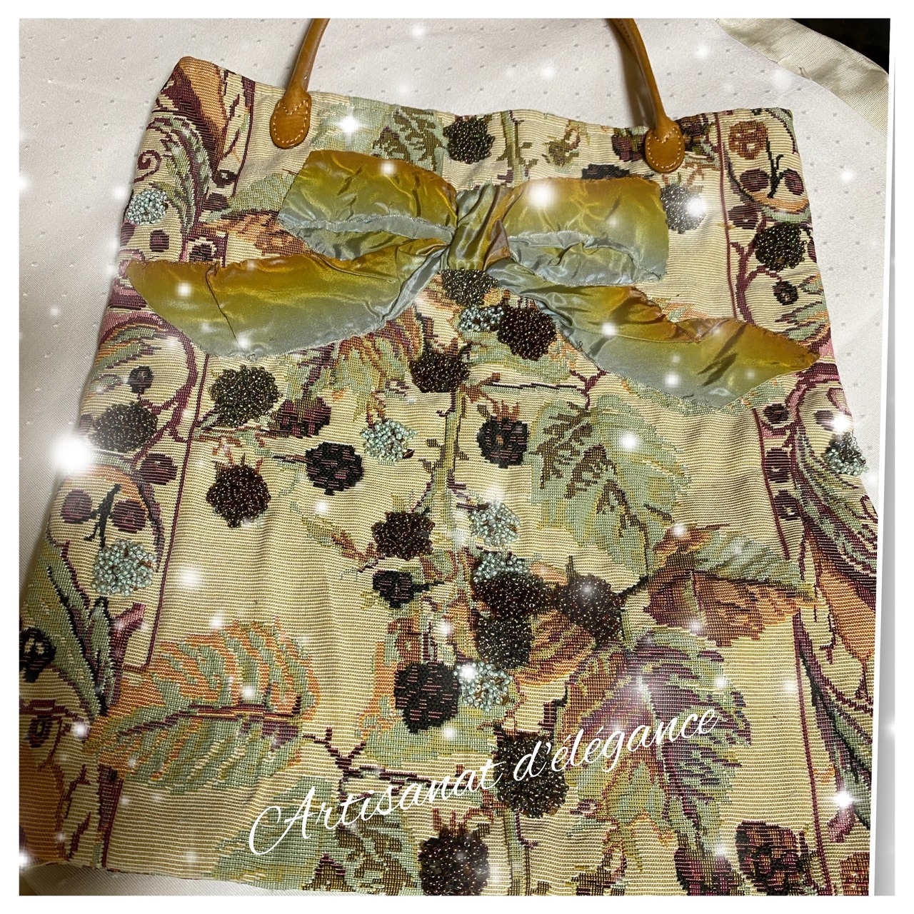 ゴブラン織りの繊細な模様に、リボンとビーズの刺繍が施されたおしゃれなトートバッグです。