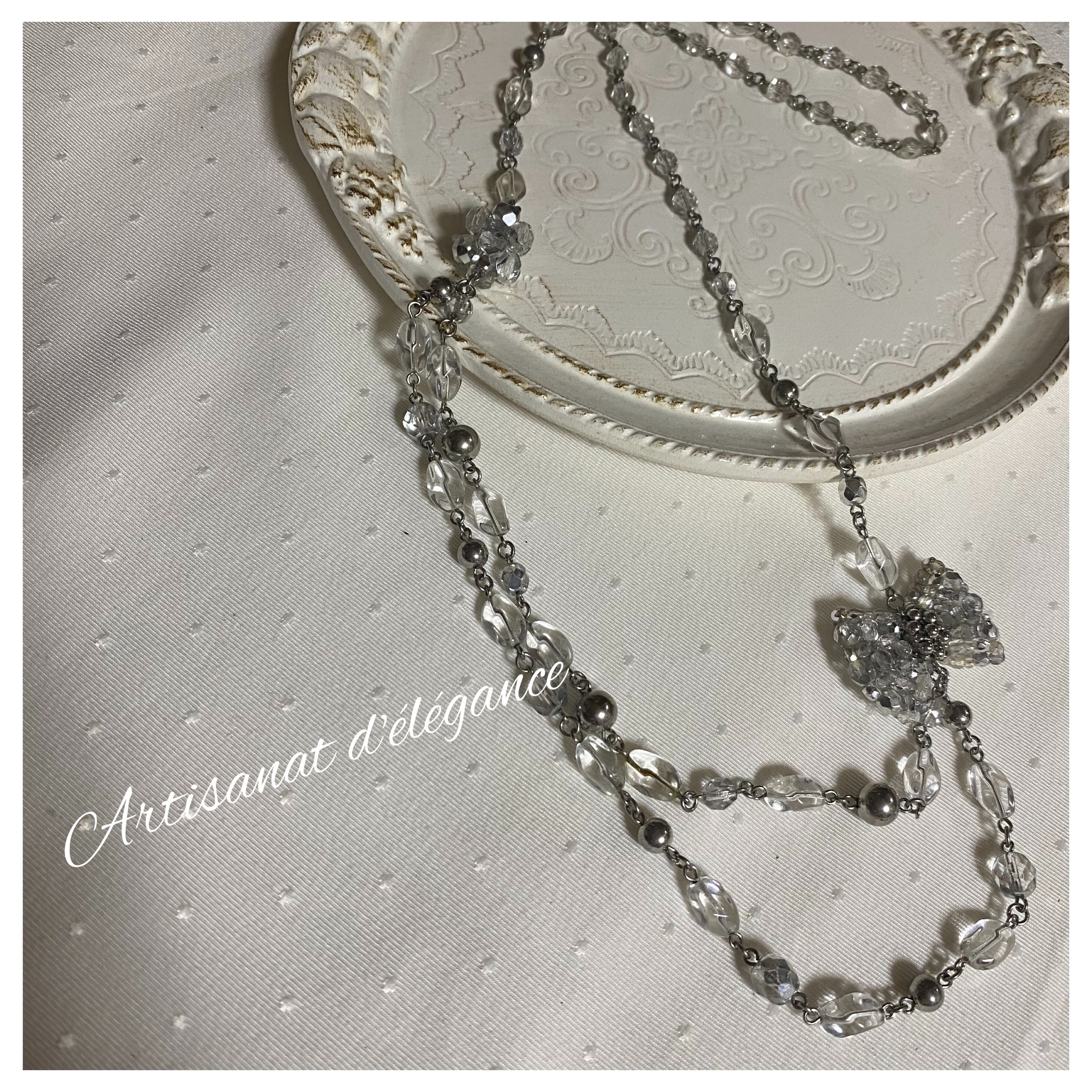 ネックレスの中央にはスパークリングなクリスタルが留まり、一層輝きを放ちます。