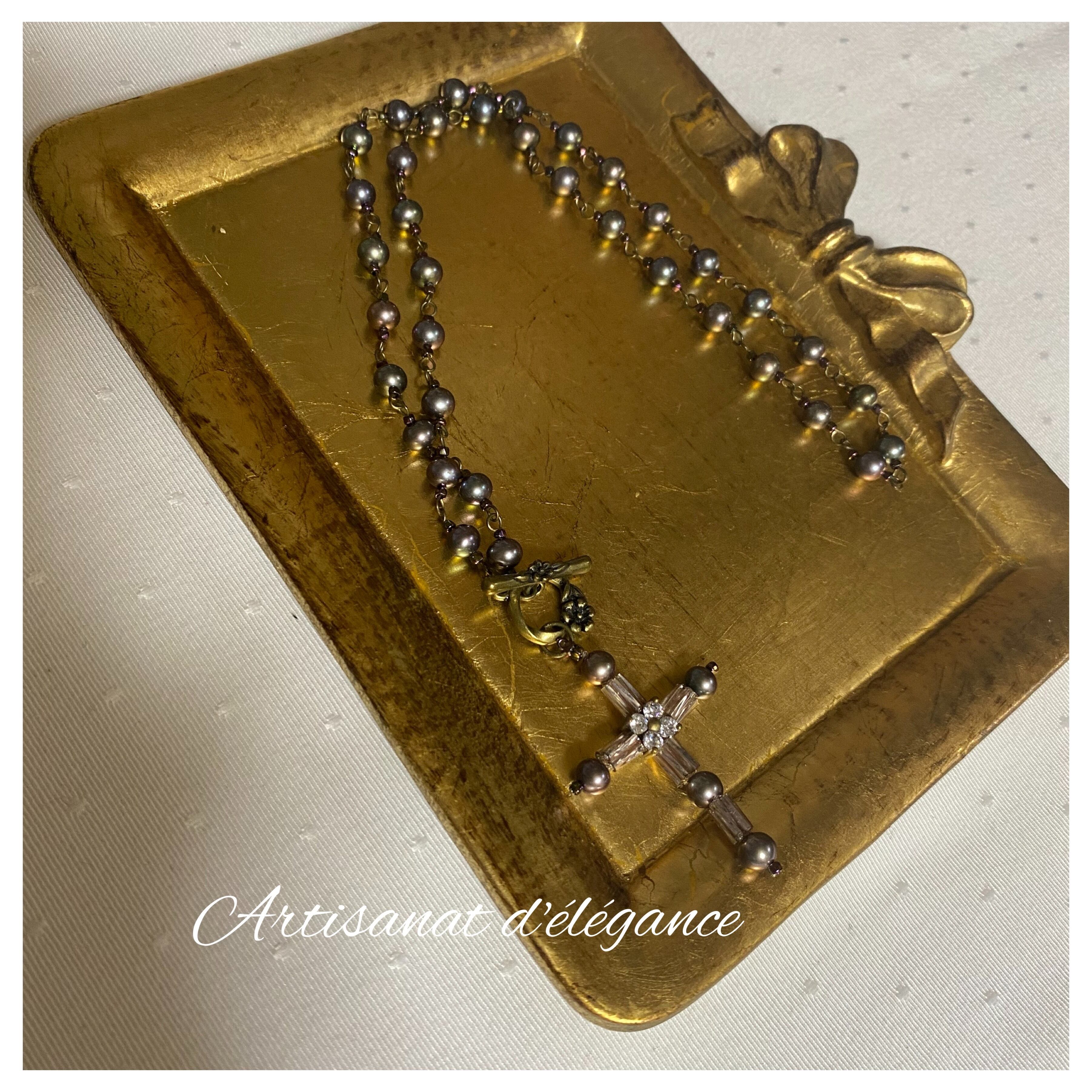 アイコニックなデザインに、輝く天然ブラックパールの輝きが映えるクロスネックレスです。